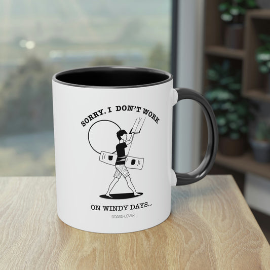 Sorry. I don`t work on windy days. Schwarz-weiß Tasse. Mann. Schwarzer Henkel und Innenseite – 0,33L